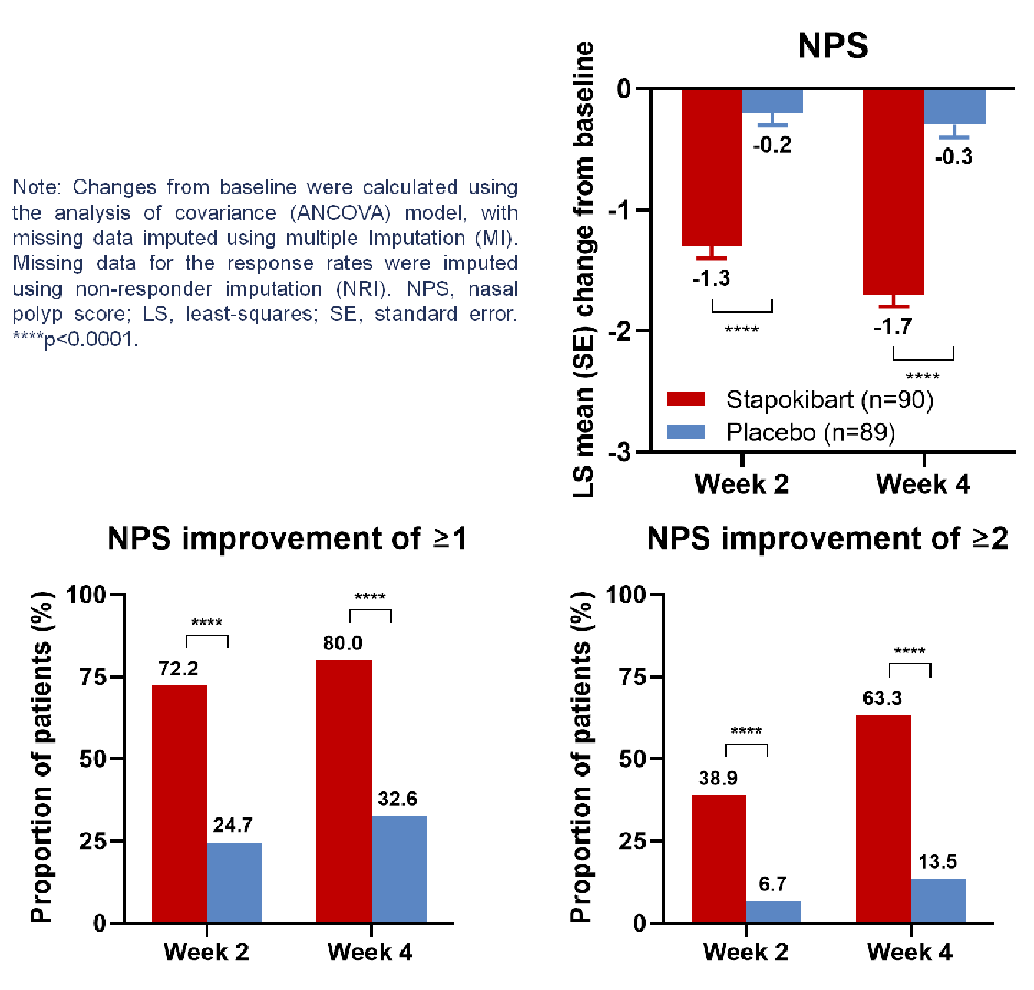 療效分析顯示,在第2周的首次評估時,司普奇拜單抗即顯著改善了鼻息肉評分(NPS)。與安慰劑相比,第2周,司普奇拜單抗組NPS較基線改善程度具有顯著優勢(組間差值的最小二乘[LS]均值-1.1,95% CI:-1.3~-0.8,p<0.0001),且在第4周進一步改善(-1.4,95%CI:-1.7~-1.1,p<0.0001)。在第2周時,司普奇拜單抗組NPS較基線改善≥1分和≥2分的應答率分別為72.2%和38.9%,顯著高于安慰劑組的24.7%和6.7%;在第4周時,應答率進一步升至 80.0%和63.3%,而安慰劑組分別為32.6%和13.5%(均 p<0.0001)(圖2)。 值得注意的是,司普奇拜單抗從第1天起即在TSS日平均值較基線上顯示顯著改善(最小二乘均值差-0.2,95%CI:-0.4~0.0,p=0.0465)。 在TSS周平均值較基線方面,司普奇拜單抗自第1周起即較安慰劑組有顯著改善(最小二乘均值差-0.4,95%CI:-0.6~-0.2,p=0.0006),且在第2–4周持續改善。此外,司普奇拜單抗自第 1 周起即顯著提高了嗅覺喪失評分改善≥0.5的應答率(13.3% vs. 3.4%,p=0.0186)。