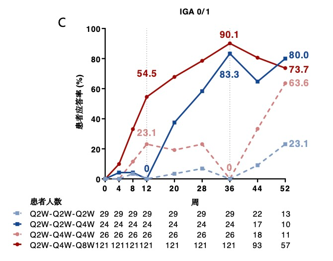 本研究尚在進行中,截至2025年4月7日,共256例患者完成12周治療,200例完成36周治療,其中85.5%的患者成功實現給藥間隔延長*。共91例患者完成52周治療,各治療組均表現出顯著且持續的皮損改善: