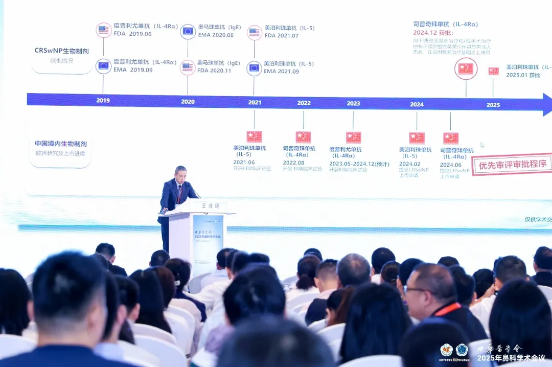會(huì)上,首都醫(yī)科大學(xué)附屬北京同仁醫(yī)院王成碩教授作為嘉賓,圍繞《破局而來(lái)——從中國(guó)意見(jiàn)書(shū)看生物制劑治療CRSwNP的優(yōu)越性》做專題報(bào)告。王成碩教授介紹了《生物制劑治療慢性鼻竇炎伴鼻息肉中國(guó)意見(jiàn)書(shū)》的核心要點(diǎn),指出生物制劑打破了難治性慢性鼻竇炎伴鼻息肉的復(fù)發(fā)難題。真實(shí)世界研究數(shù)據(jù)顯示,司普奇拜單抗快速起效、強(qiáng)效持久,停藥10周仍可獲益。它精準(zhǔn)靶向IL-4Rα,雙重阻斷信號(hào)通路,直擊病理核心,減輕炎癥反應(yīng),重塑了治療格局。