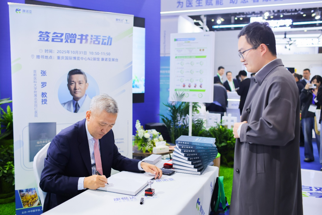 10月31日上午,首都醫科大學附屬北京同仁醫院張羅教授蒞臨康諾亞展臺,為與會專家和代表簽名并贈送了其編寫的學科權威書籍《慢性鼻竇炎》,面對面交流探討慢性鼻竇炎診療領域的最新進展,活動引發廣泛關注與參與。
